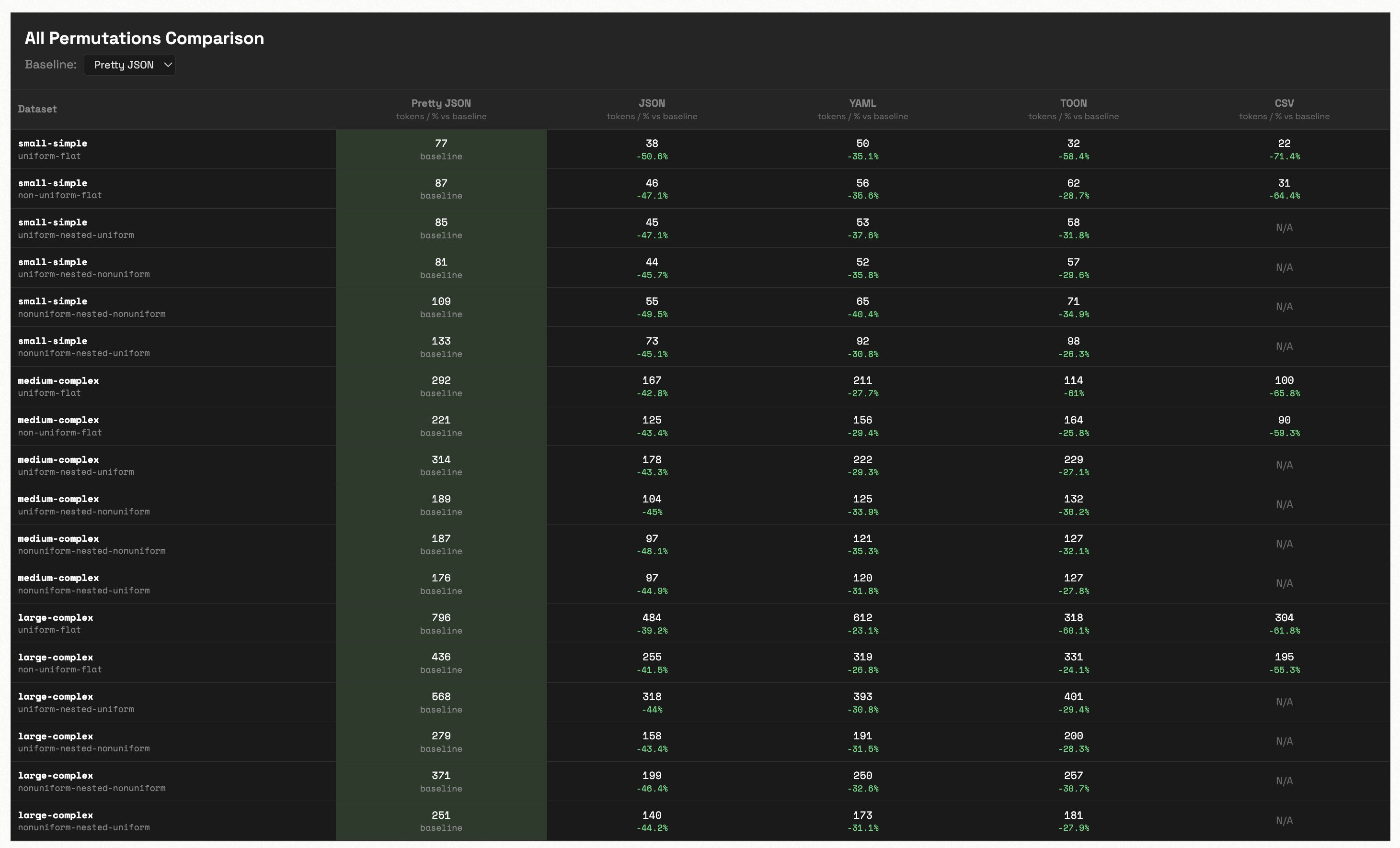 When your data is flat/uniform, CSV achieves 30-40% token savings. But it can’t handle nested objects (hence all the N/A).