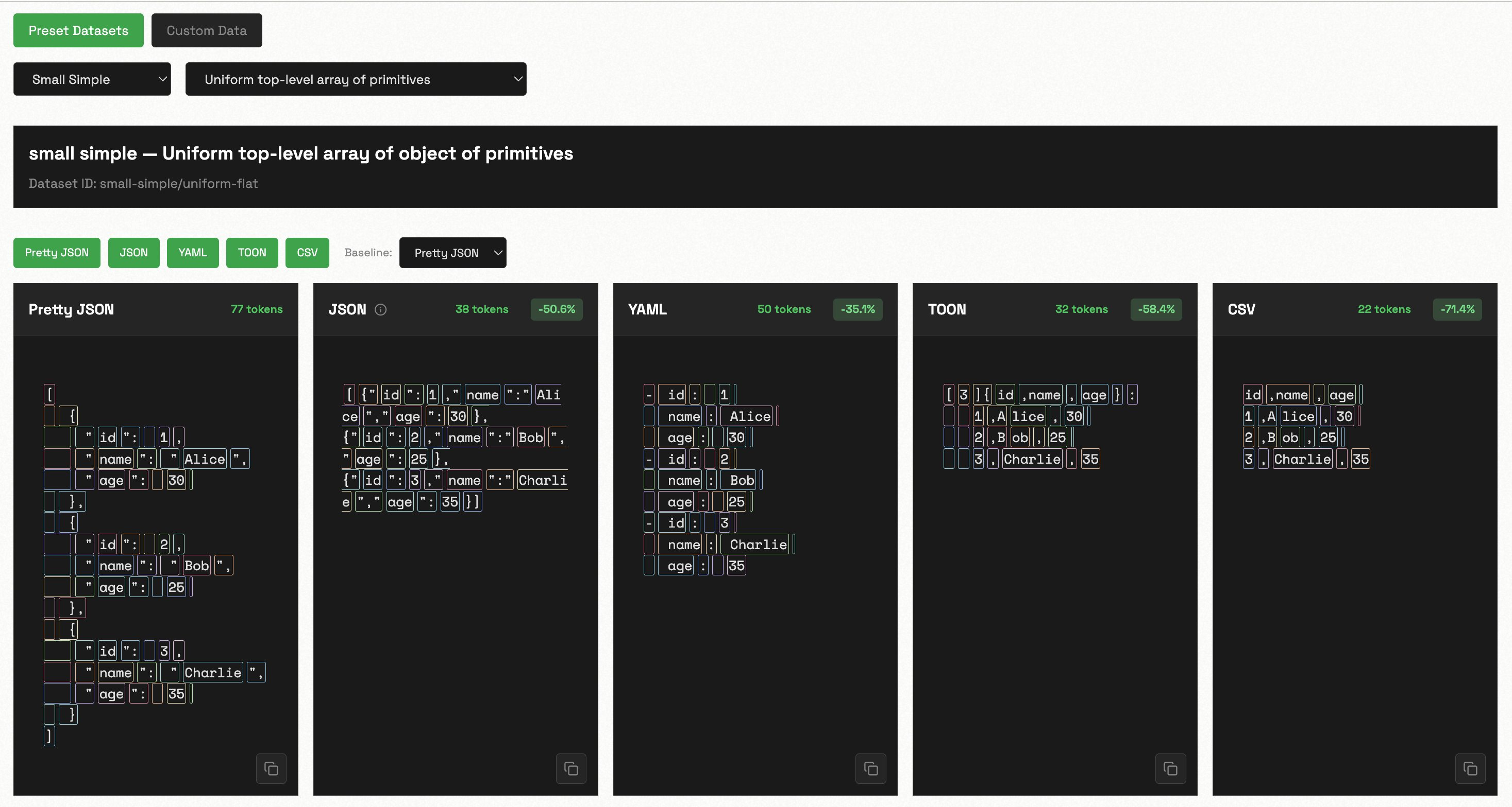 If your data is uniform (same keys in every record) and flat (no nesting), CSV absolutely crushes everything with 30-40% token savings. That’s because it declares headers once and just lists values.